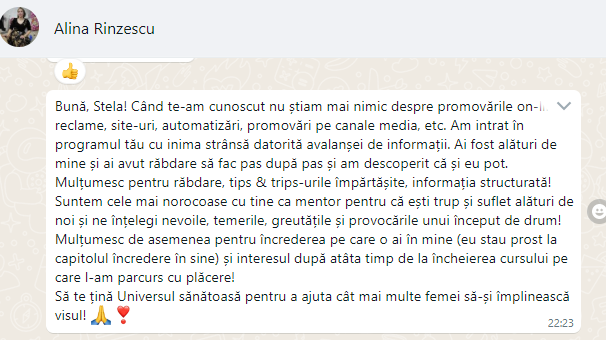 ✅ Dupa ce implementezi cei 5 pasi nu o sa mai fie nevoie sa iti spunem noi ce sa faci pentru a creste vanzarile si inscrierile. O sa te descurci singura, iar cu abilitatile dobandite - ti se vor deschide apoi mult mai multe oportunitati.