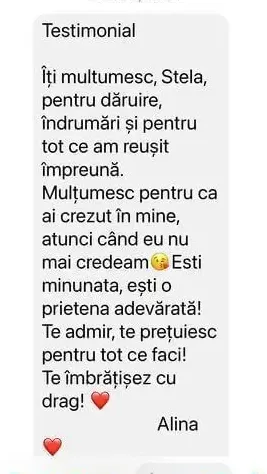 „Îți mulțumesc, Stela, pentru dăruire, îndrumări și tot ce am reușit împreună. Îți mulțumesc că ai crezut în mine atunci când eu nu mai credeam. Ești minunată, ești o prietenă adevărată! Te admir, te prețuiesc pentru tot ce faci! Te îmbrățișez cu drag!”
