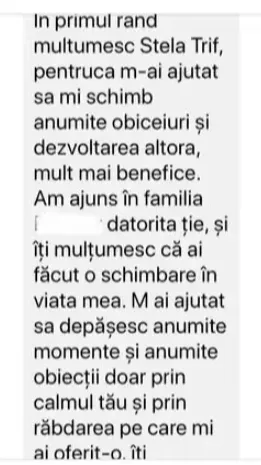 „Aș dori în primul rând să îți mulțumesc că ai apărut în viața mea și odată cu tine și această minunată oportunitate, fără ea nu știu ce m-aș fi facut. Apoi pentru răbdarea pe care ai avut-o cu mine de-a lungul timpului , tu m-ai făcut să înțeleg că fără acțiune zilnică nu poți avea rezultatele pe care le dorești. Mai mult de atât tu ești un mentor pentru mine ,te admir pentru că ești un exemplu de perseverență și tărie și orele petrecute alături de tine și echipa la webinariile tale m-au ajutat enorm să cresc în afacere, să am mai multă încredere în mine și să pot fi de folos oamenilor. Îți mulțumesc pentru toate aceste lucruri și te îmbrățișez cu respect și recunoștință.”