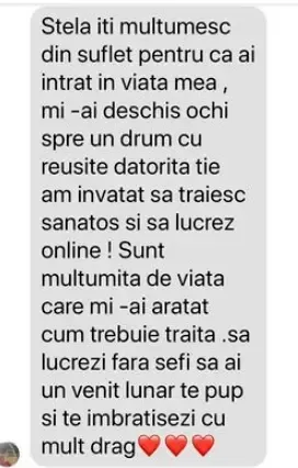 „Nu mi-am putut imagina că voi învăța atât de multe de la Stela! Când ne-am cunoscut, eram prinsă până în gât în hatzishul network marketingului. Credeam că nu o să-i mai dau vreodată de capăt! De fapt, credeam că sunt inajutabilă! Dar răbdarea și dedicarea ei m-au salvat! Mulțumesc @Stela Trif!"