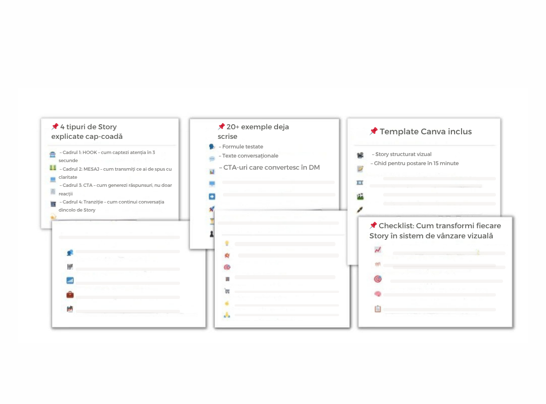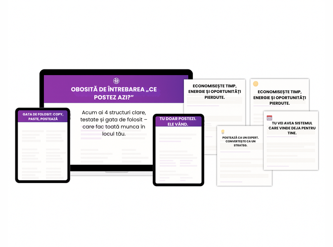 Primesti acces instant la 4 formate testate, 20+ texte copy-paste, CTA-uri care declanseaza leaduri si template-uri vizuale. Totul e structurat, pregatit, usor de aplicat — chiar daca ai doar 300 de urmaritori.